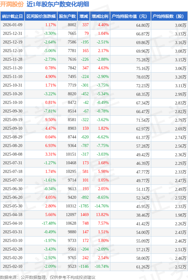 证券之星消息,近日开润股份披露,截至2026年1月9日公司股东户数为8002.0户,较12月31日增加337.0户,增幅为4.4%。户均持股数量由上期的3.13万股减少至3.0万股,户均持股市值为64.8万元。