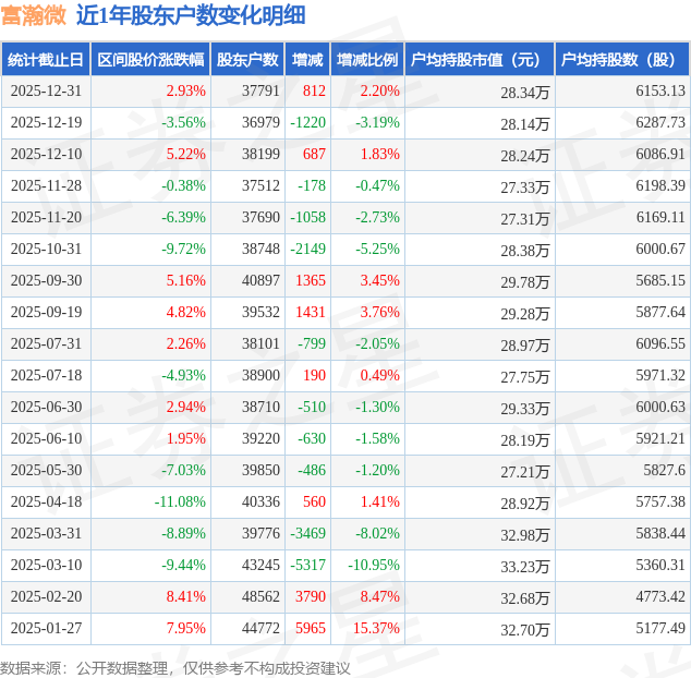 从股价来看,2025年12月19日至2025年12月31日,富瀚微区间涨幅为2.93%,在此期间股东户数增加812.0户,增幅为2.2%。