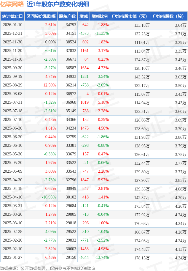 证券之星消息,近日亿联网络披露,截至2026年1月10日公司股东户数为3.48万户,较12月31日增加642.0户,增幅为1.88%。户均持股数量由上期的3.71万股减少至3.64万股,户均持股市值为133.18万元。