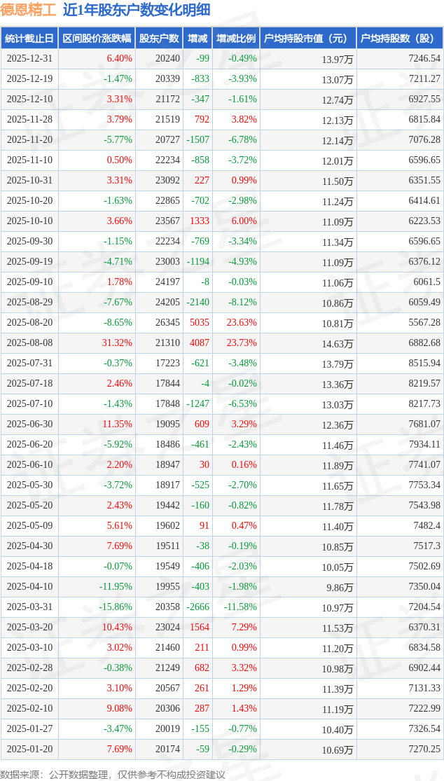 从股价来看,2025年12月19日至2025年12月31日,德恩精工区间涨幅为6.4%,在此期间股东户数减少99.0户,减幅为0.49%。