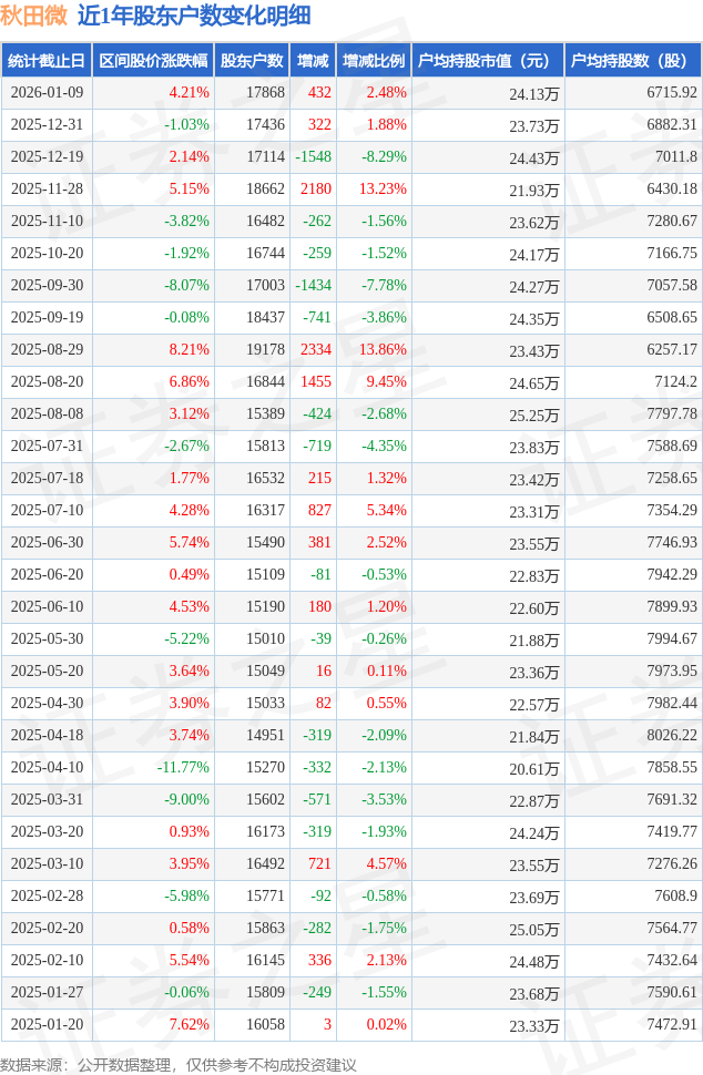 从股价来看,2025年12月31日至2026年1月9日,秋田微区间涨幅为4.21%,在此期间股东户数增加432.0户,增幅为2.48%。