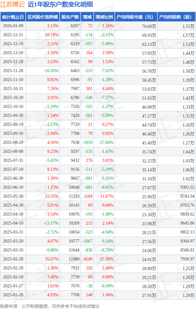 证券之星消息,近日江苏博云披露,截至2026年1月9日公司股东户数为6267.0户,较12月31日增加72.0户,增幅为1.16%。户均持股数量由上期的1.57万股减少至1.55万股,户均持股市值为70.6万元。