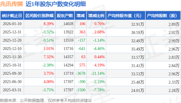 证券之星消息,近日兆讯传媒披露,截至2026年1月10日公司股东户数为1.4万户,较12月31日增加106.0户,增幅为0.76%。户均持股数量由上期的2.92万股减少至2.89万股,户均持股市值为32.91万元。