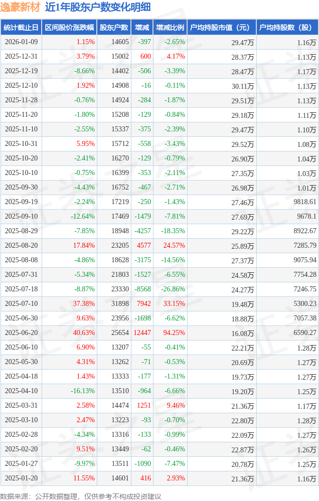 从股价来看,2025年12月31日至2026年1月9日,逸豪新材区间涨幅为1.15%,在此期间股东户数减少397.0户,减幅为2.65%。