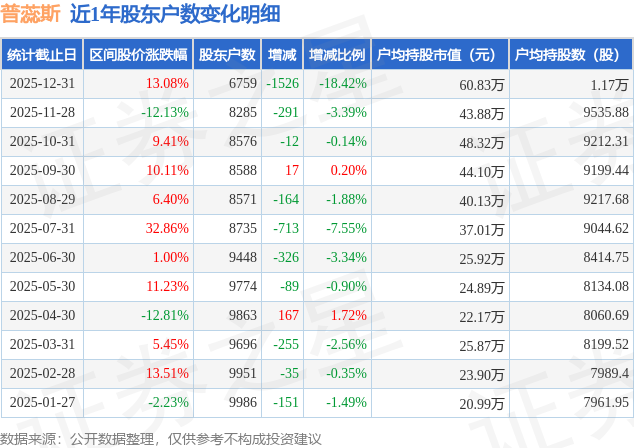 从股价来看,2025年11月28日至2025年12月31日,普蕊斯区间涨幅为13.08%,在此期间股东户数减少1526.0户,减幅为18.42%。