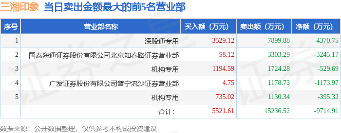 证券之星消息,沪深交易所2026年1月12日公布的交易公开信息显示,三湘印象(000863)因日跌幅偏离值达到7%的前5只证券登上龙虎榜。此次是近5个交易日内第1次上榜。