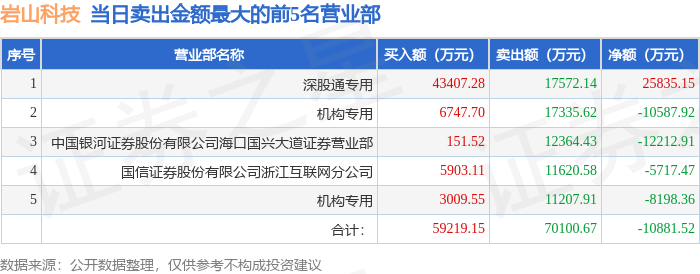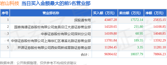 证券之星消息,沪深交易所2026年1月12日公布的交易公开信息显示,岩山科技(002195)因日涨幅偏离值达到7%的前5只证券登上龙虎榜。此次是近5个交易日内第3次上榜。