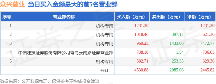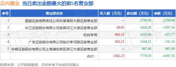 证券之星消息,沪深交易所2026年1月12日公布的交易公开信息显示,众兴菌业(002772)因日跌幅偏离值达到7%的前5只证券登上龙虎榜。此次是近5个交易日内第1次上榜。