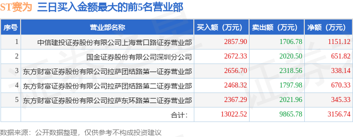 证券之星消息,沪深交易所2026年1月12日公布的交易公开信息显示,ST赛为(300044)因连续三个交易日内,涨幅偏离值累计达到30%的证券登上龙虎榜。此次是近5个交易日内第1次上榜。