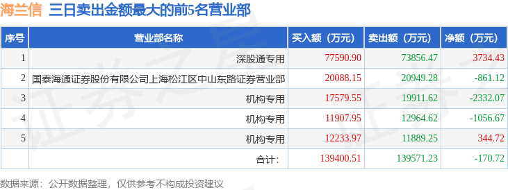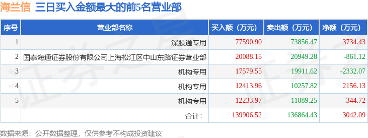 从龙虎榜公布的三日买卖数据来看,机构合计净卖出887.89万元,北向资金合计净买入3734.43万元。上海中山东路等知名游资榜上有名。(知名游资上海中山东路一般指国泰海通证券股份有限公司上海松江区中山东路证券营业部席位、知名游资上海中山东路一般指国泰海通证券股份有限公司上海松江区中山东路证券营业部席位,根据市场资料整理,仅供参考)