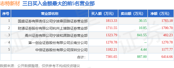 从龙虎榜公布的三日买卖数据来看,宁波桑田路、上塘路等知名游资榜上有名。(知名游资宁波桑田路一般指国盛证券有限责任公司宁波桑田路证券营业部席位、知名游资上塘路一般指财通证券股份有限公司杭州上塘路证券营业部席位,根据市场资料整理,仅供参考)