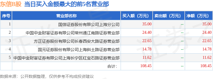 证券之星消息,沪深交易所2026年1月12日公布的交易公开信息显示,东信B股(900941)因有价格涨跌幅限制的日收盘价格涨幅偏离值达到7%的前五只证券登上龙虎榜。此次是近5个交易日内第1次上榜。