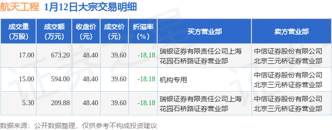 证券之星消息,1月12日航天工程发生大宗交易,交易数据如下: