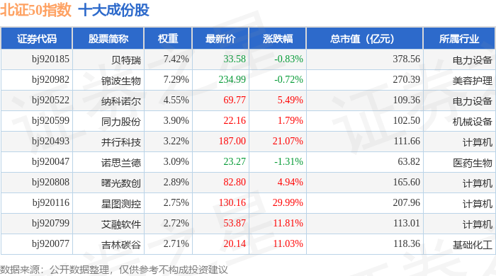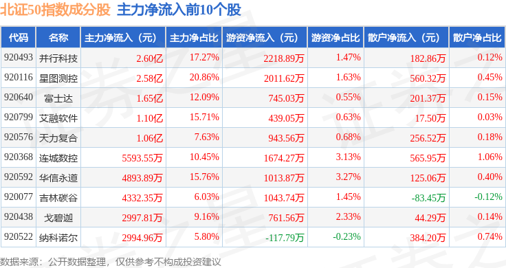 资金流向方面,北证50(899050)指数成份股当日主力资金净流入合计12.96亿元,游资资金净流入合计1.99亿元,散户资金净流入合计4884.65万元。成份股资金流向详情见下表: