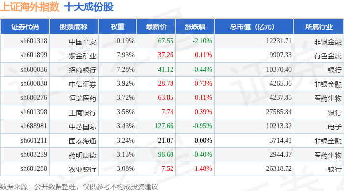 证券之星消息,1月12日,上证海外(000054)指数报收于1650.02点,跌0.22%,成交1327.62亿元,换手率0.39%。当日该指数成份股中,上涨的有40家,山东黄金以2.86%的涨幅领涨,下跌的有23家,中国石化以3.08%的跌幅领跌。