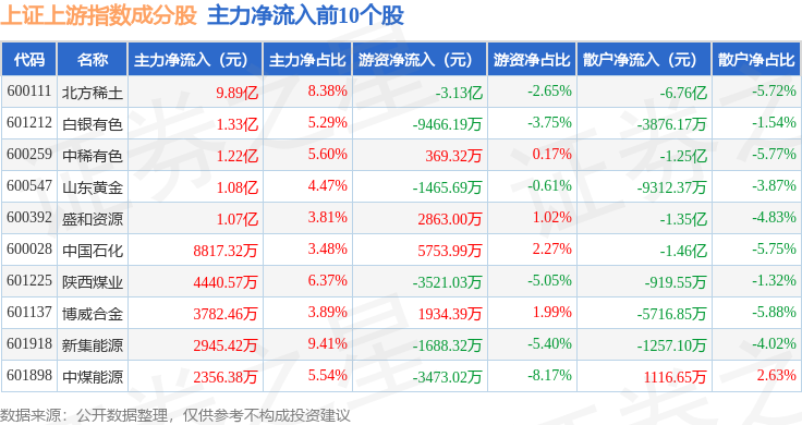 资金流向方面,上证上游(000094)指数成份股当日主力资金净流出合计33.82亿元,游资资金净流入合计8.55亿元,散户资金净流入合计25.27亿元。成份股资金流向详情见下表: