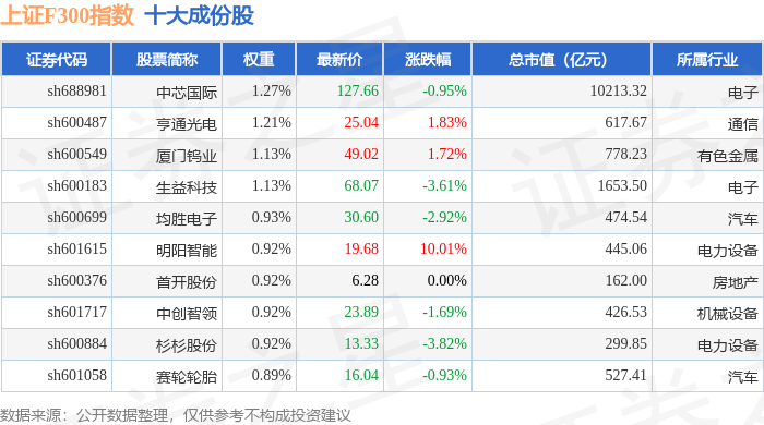 上证F300(000099)指数十大成份股详情如下: