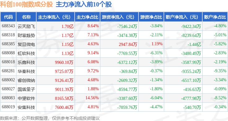 资金流向方面,科创100(000698)指数成份股当日主力资金净流出合计32.58亿元,游资资金净流入合计12.75亿元,散户资金净流入合计19.83亿元。成份股资金流向详情见下表: