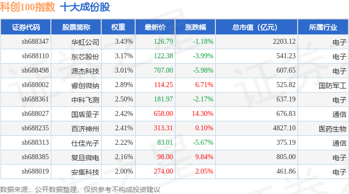 科创100(000698)指数十大成份股详情如下: