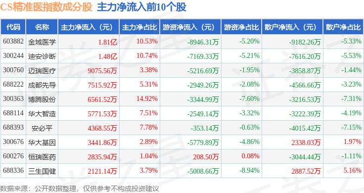 资金流向方面,CS精准医(000863)指数成份股当日主力资金净流入合计900.68万元,游资资金净流出合计2.51亿元,散户资金净流入合计2.42亿元。成份股资金流向详情见下表: