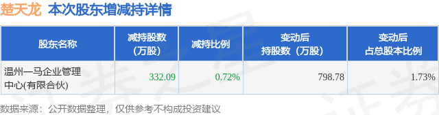 证券之星消息,1月12日楚天龙发布公告《楚天龙:关于股东减持计划时间届满暨实施情况的公告》,其股东温州一马企业管理中心(有限合伙)于2025年12月26日至2026年1月9日间合计减持332.09万股,占公司目前总股本的0.7202%,变动期间该股股价上涨2.61%,截止1月9日收盘报20.06元。