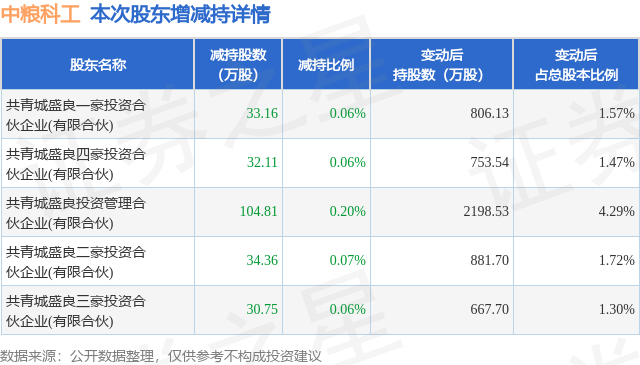 证券之星消息,1月12日中粮科工发布公告《中粮科工:关于合计持股5%以上股东减持期限届满暨实施情况的公告》,其股东共青城盛良一豪投资合伙企业(有限合伙)、共青城盛良四豪投资合伙企业(有限合伙)、共青城盛良投资管理合伙企业(有限合伙)、共青城盛良二豪投资合伙企业(有限合伙)、共青城盛良三豪投资合伙企业(有限合伙)于2025年12月25日至2026年1月9日间合计减持235.19万股,占公司目前总股本的0.4591%,变动期间该股股价上涨1.64%,截止1月9日收盘报11.14元。