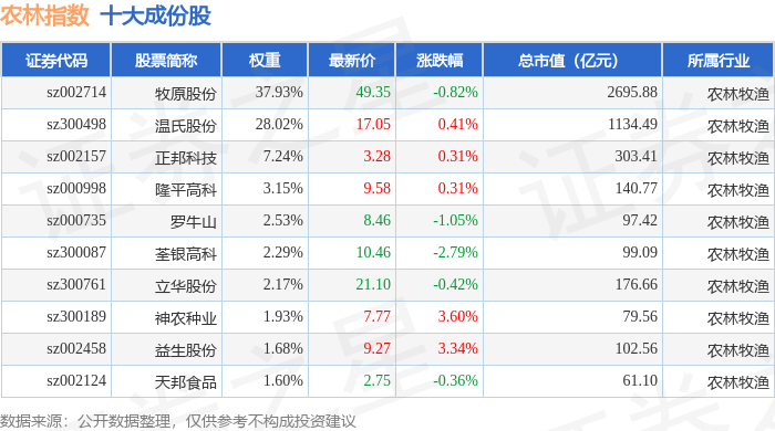 资金流向方面,农林指数(399231)成份股当日主力资金净流出合计3.9亿元,游资资金净流入合计1.88亿元,散户资金净流入合计2.03亿元。成份股资金流向详情见下表: