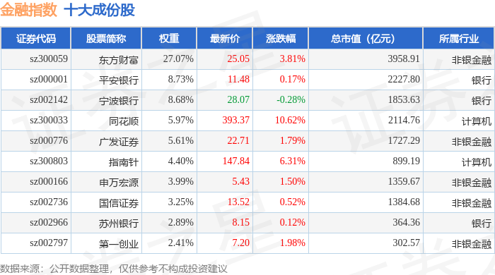 证券之星消息,1月12日,金融指数(399240)报收于1678.9点,涨2.65%,成交588.64亿元,换手率1.82%。当日该指数成份股中,上涨的有30家,同花顺以10.62%的涨幅领涨,下跌的有1家,宁波银行以0.28%的跌幅领跌。