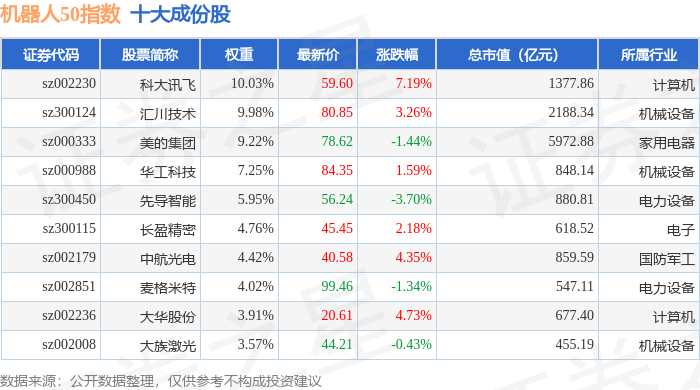 证券之星消息,1月12日,机器人50(399283)指数报收于4735.24点,涨2.32%,成交810.03亿元,换手率5.11%。当日该指数成份股中,上涨的有39家,航天智装以14.05%的涨幅领涨,下跌的有9家,先导智能以3.7%的跌幅领跌。