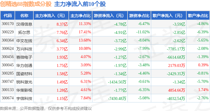 资金流向方面,创精选88(399291)指数成份股当日主力资金净流入合计10.59亿元,游资资金净流出合计16.69亿元,散户资金净流入合计6.1亿元。成份股资金流向详情见下表: