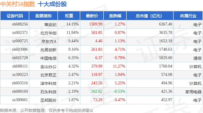 中关村50(399423)指数十大成份股详情如下: