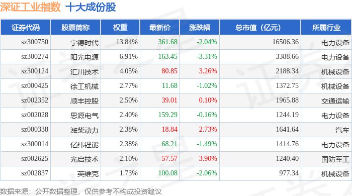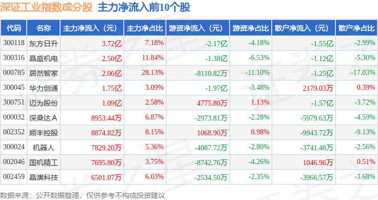 资金流向方面,深证工业(399615)指数成份股当日主力资金净流出合计132.39亿元,游资资金净流入合计23.57亿元,散户资金净流入合计108.82亿元。成份股资金流向详情见下表: