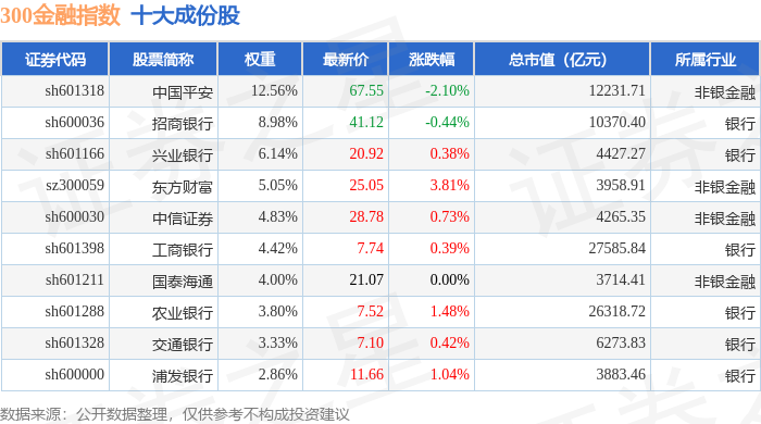300金融(399914)指数十大成份股详情如下: