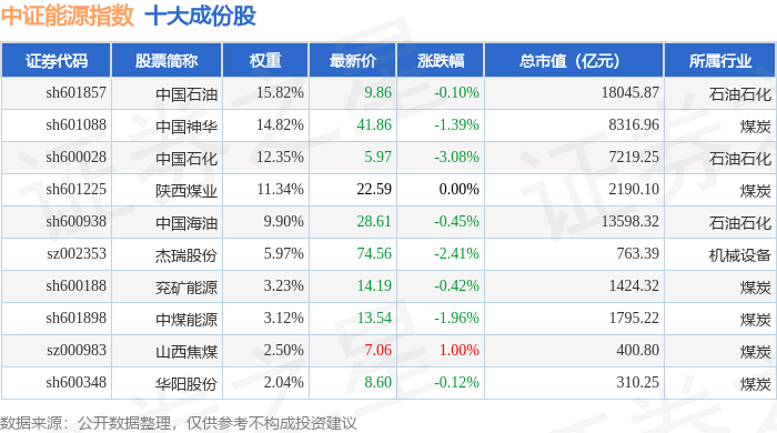 中证能源(399928)指数十大成份股详情如下: