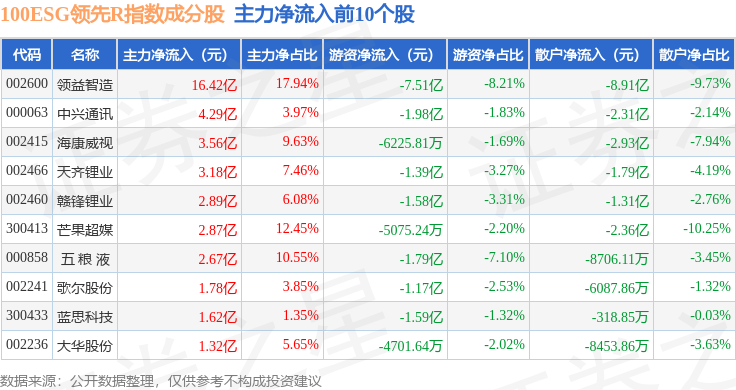 资金流向方面,100ESG领先R(470030)指数成份股当日主力资金净流出合计25.27亿元,游资资金净流出合计1.07亿元,散户资金净流入合计26.34亿元。成份股资金流向详情见下表: