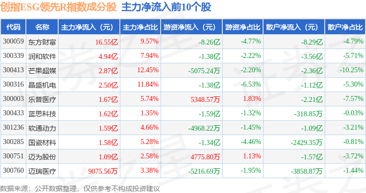 资金流向方面,创指ESG领先R(470031)指数成份股当日主力资金净流出合计38.64亿元,游资资金净流入合计7.53亿元,散户资金净流入合计31.1亿元。成份股资金流向详情见下表: