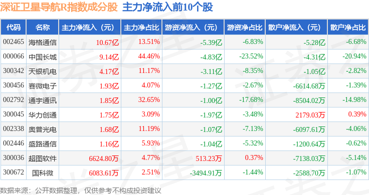 资金流向方面,深证卫星导航R(470050)指数成份股当日主力资金净流入合计25.64亿元,游资资金净流出合计20.22亿元,散户资金净流出合计5.42亿元。成份股资金流向详情见下表: