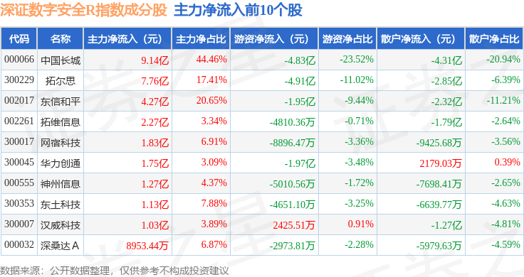 资金流向方面,深证数字安全R(470052)指数成份股当日主力资金净流入合计34.86亿元,游资资金净流出合计22.45亿元,散户资金净流出合计12.41亿元。成份股资金流向详情见下表:
