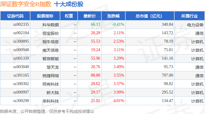 证券之星消息,1月12日,深证数字安全R(470052)指数报收于4159.04点,涨7.01%,成交875.5亿元,换手率9.92%。当日该指数成份股中,上涨的有49家,拓尔思以20.02%的涨幅领涨,下跌的有1家,科华数据以0.41%的跌幅领跌。