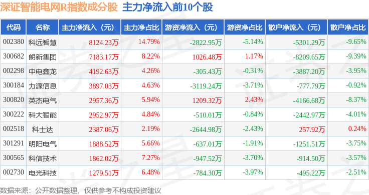 资金流向方面,深证智能电网R(470054)指数成份股当日主力资金净流出合计32.46亿元,游资资金净流入合计10.6亿元,散户资金净流入合计21.86亿元。成份股资金流向详情见下表: