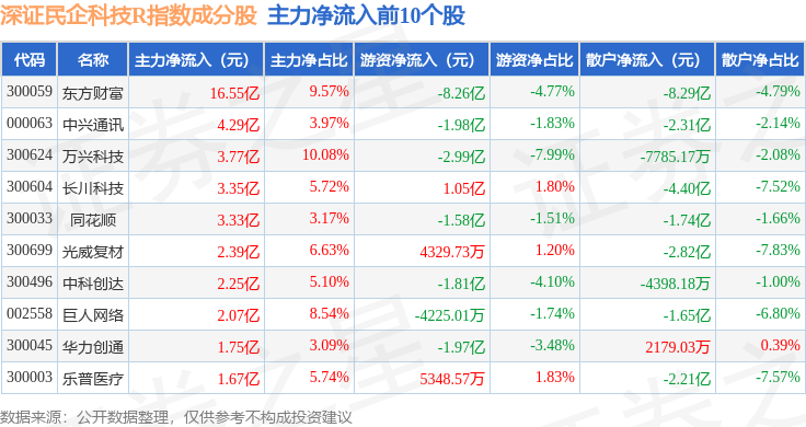 资金流向方面,深证民企科技R(470059)指数成份股当日主力资金净流出合计23.43亿元,游资资金净流入合计6.06亿元,散户资金净流入合计17.37亿元。成份股资金流向详情见下表: