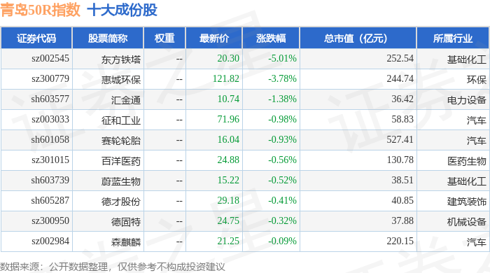 青岛50R(489011)指数十大成份股详情如下: