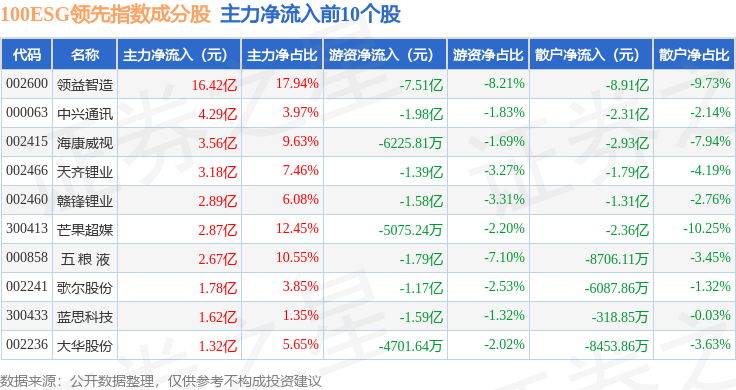 资金流向方面,100ESG领先(970030)指数成份股当日主力资金净流出合计25.27亿元,游资资金净流出合计1.07亿元,散户资金净流入合计26.34亿元。成份股资金流向详情见下表: