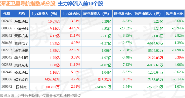 资金流向方面,深证卫星导航(970050)指数成份股当日主力资金净流入合计25.64亿元,游资资金净流出合计20.22亿元,散户资金净流出合计5.42亿元。成份股资金流向详情见下表: