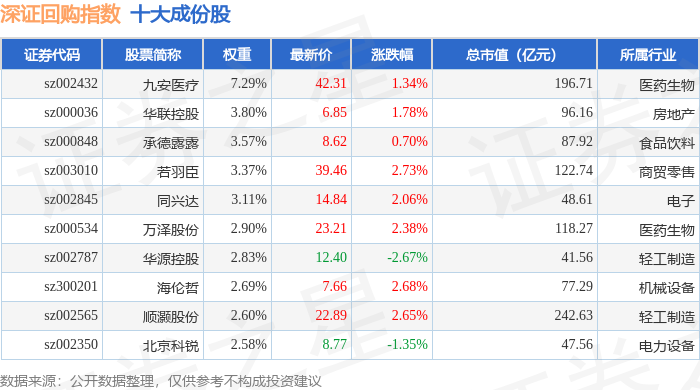 深证回购(970063)指数十大成份股详情如下:
