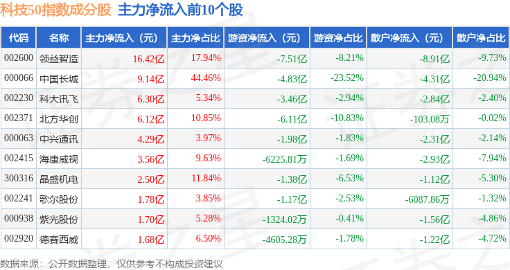 资金流向方面,科技50(970080)指数成份股当日主力资金净流出合计33.48亿元,游资资金净流出合计4.73亿元,散户资金净流入合计38.21亿元。成份股资金流向详情见下表: