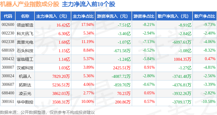资金流向方面,机器人产业(980022)指数成份股当日主力资金净流入合计6.75亿元,游资资金净流出合计5.64亿元,散户资金净流出合计9214.91万元。成份股资金流向详情见下表: