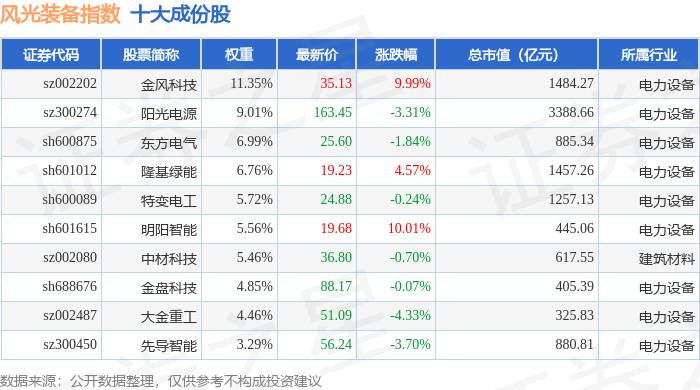 证券之星消息,1月12日,风光装备(980026)指数报收于2012.89点,涨2.09%,成交854.62亿元,换手率4.2%。当日该指数成份股中,上涨的有17家,明阳智能以10.01%的涨幅领涨,下跌的有13家,电气风电以4.45%的跌幅领跌。