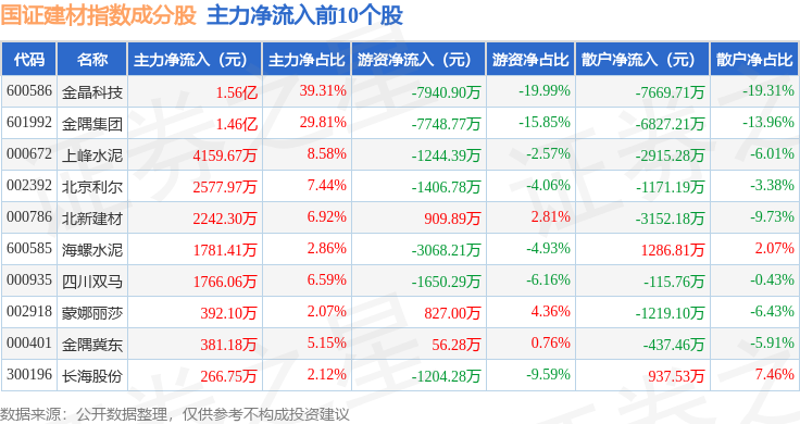 资金流向方面,国证建材(980048)指数成份股当日主力资金净流出合计3.71亿元,游资资金净流出合计4167.96万元,散户资金净流入合计4.12亿元。成份股资金流向详情见下表: