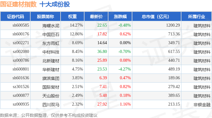 证券之星消息,1月12日,国证建材(980048)指数报收于5111.12点,涨0.44%,成交131.78亿元,换手率2.23%。当日该指数成份股中,上涨的有21家,金隅集团以10.23%的涨幅领涨,下跌的有8家,华新建材以4.27%的跌幅领跌。